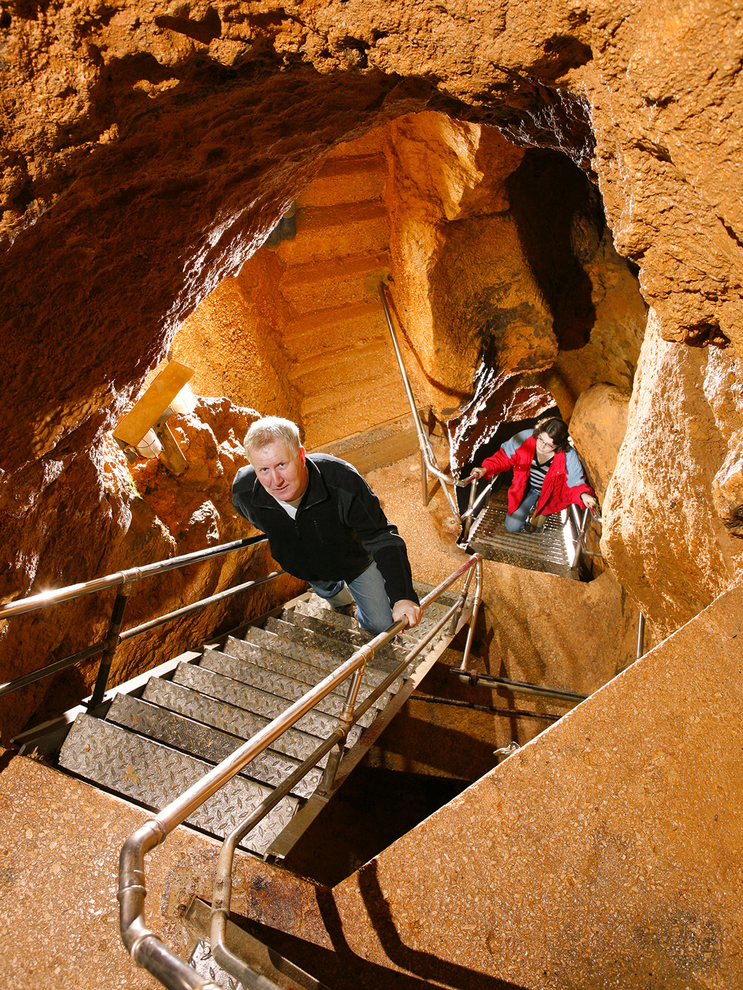 Über mehrere Eisentreppen kann der Besucher auf einem 330m langen Weg bis in eine Tiefe von 55m gewaltige Schächte und große Hallen bewundern.