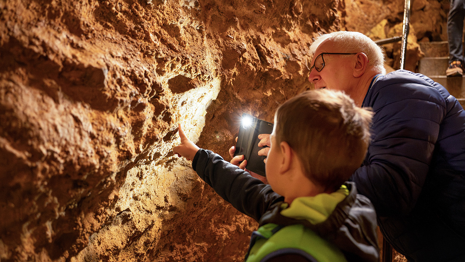 In der Höhle gibt es fünf Audiostelen, an denen wahlweise Informationen in Deutsch, Englisch, Französisch oder speziell für Kinder abgerufen werden können. Tauchen Sie ein in das Abenteuer Tiefenhöhle – ganz individuell nach Ihren Wünschen.